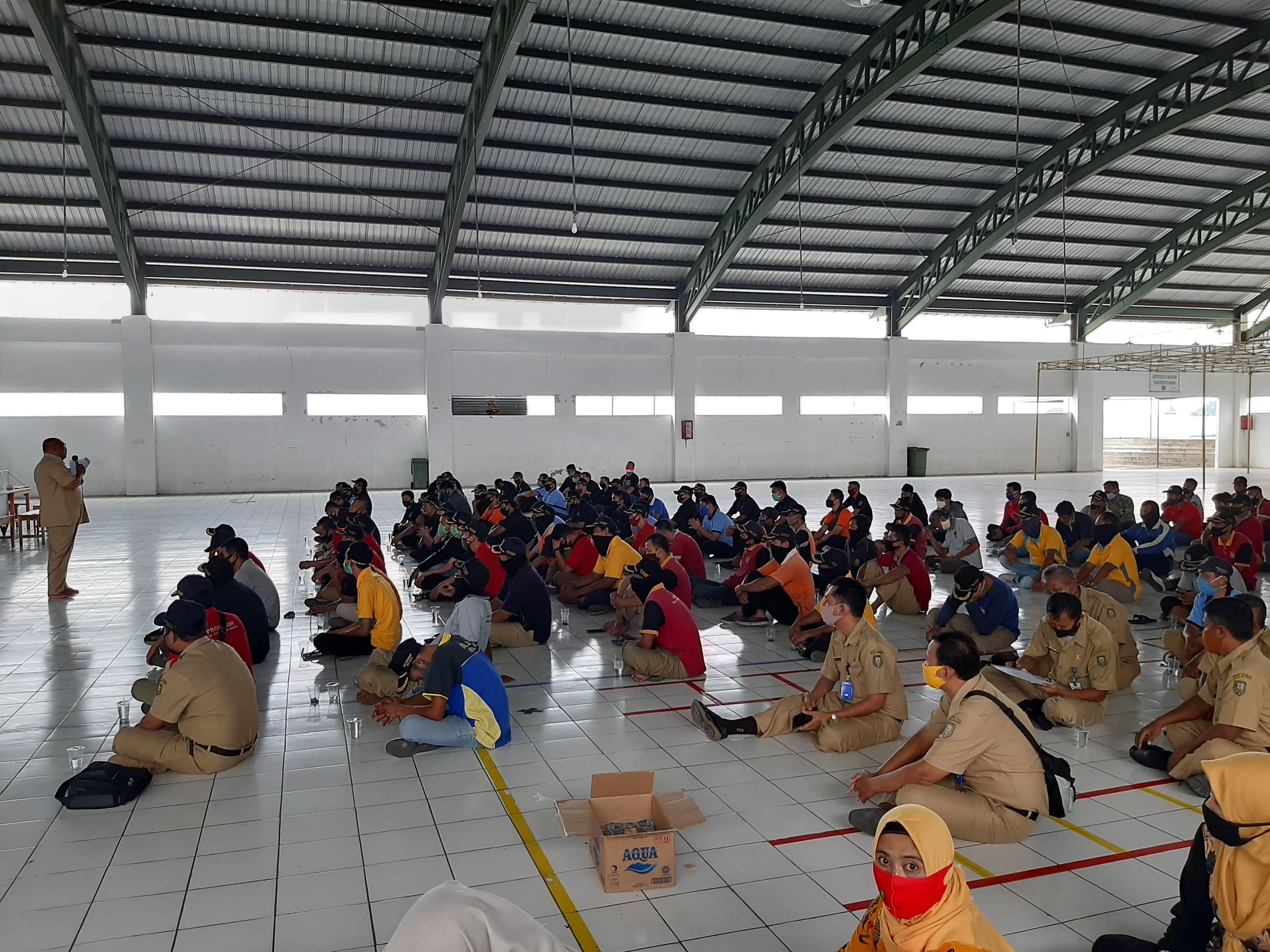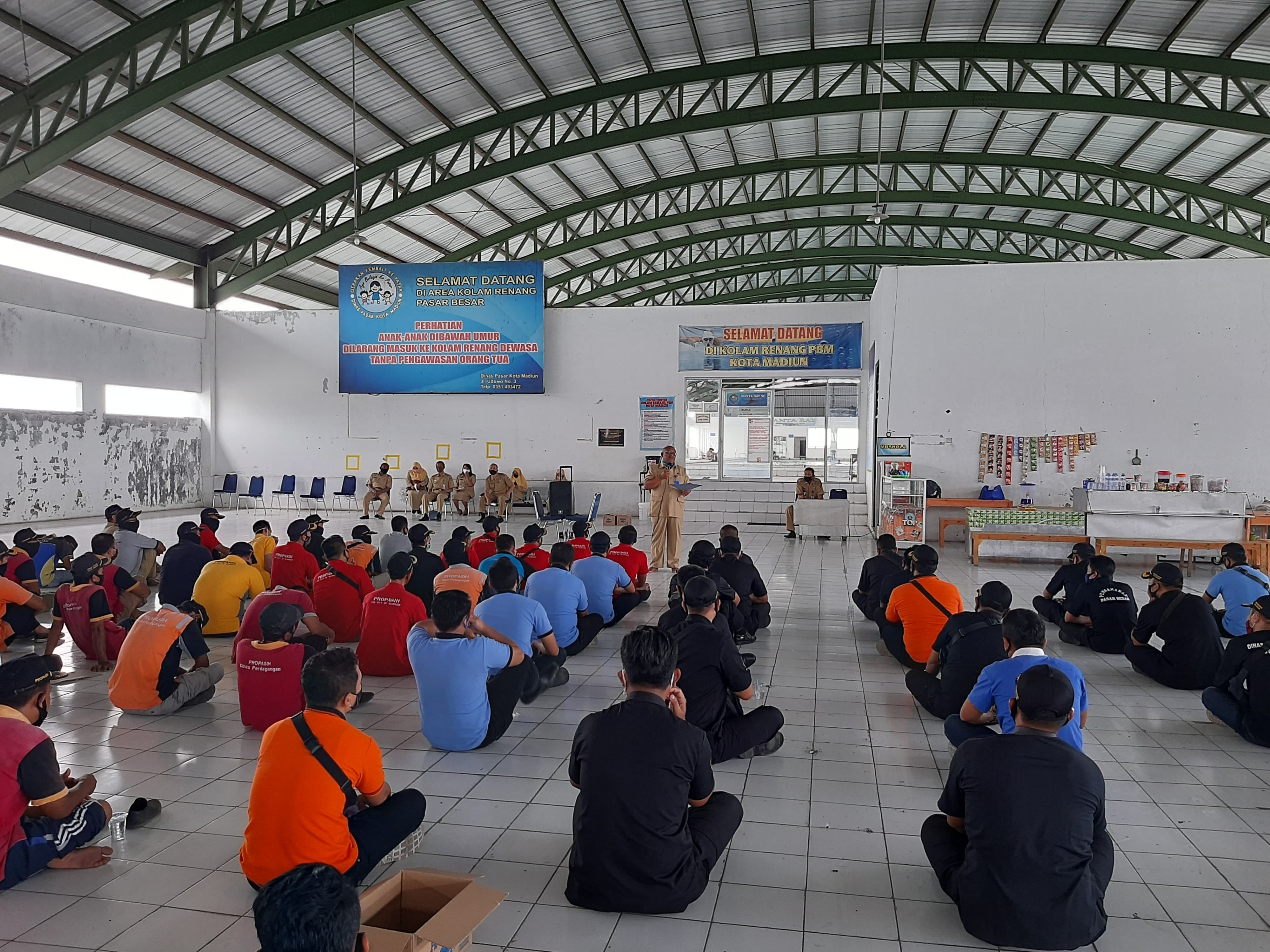 MADIUN – menindaklanjuti hasil pengarahan Bapak Walikota Madiun pada apel pejabat struktural di Bumi Perkemahan Ngrowo, mengenai Perwal Nomor 39 Tahun 2020 tentang penerapan disiplin dan penegakan hukum protokol kesehatan sebagai upaya pencegahan dan pengendalian corona virus desease 2019, Kepala Dinas Perdagangan Kota Madiun segera mengumpulkan seluruh pegawai untuk diberikan pengarahan pada Senin (31/08). Bertempat di hall kolam renang Pasar Besar Madiun, pengarahan dimulai pukul 13.00 WIB.