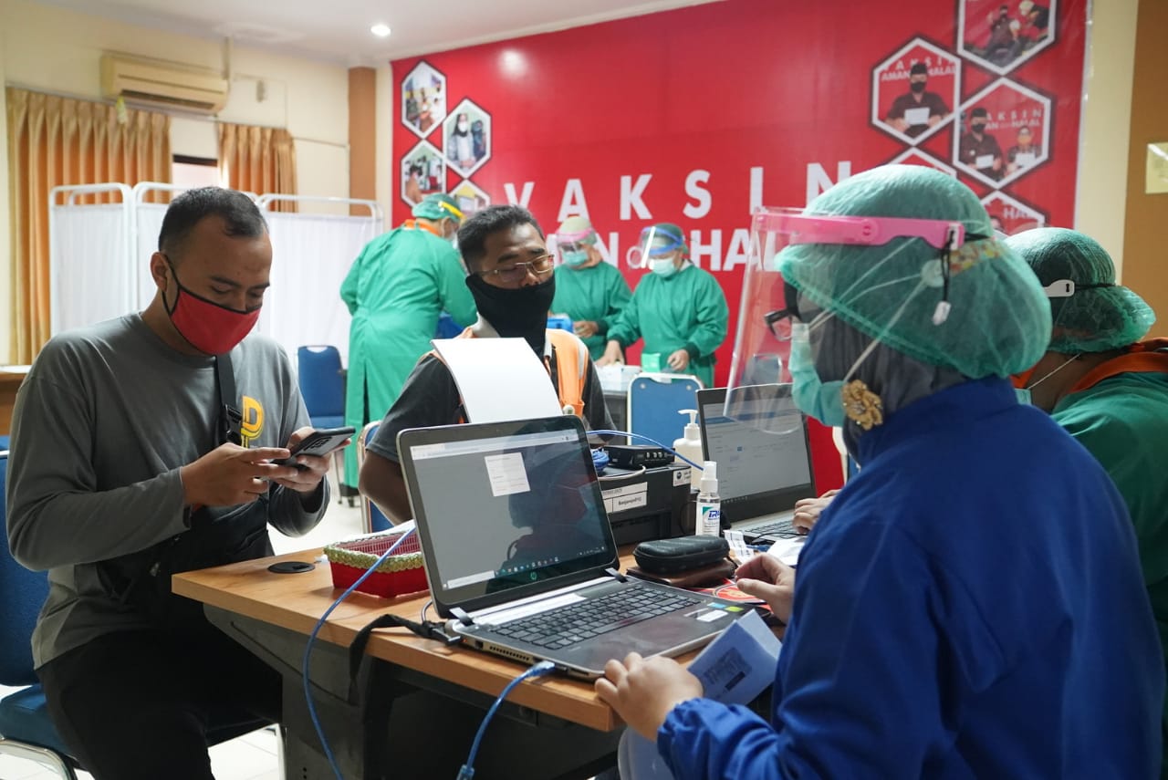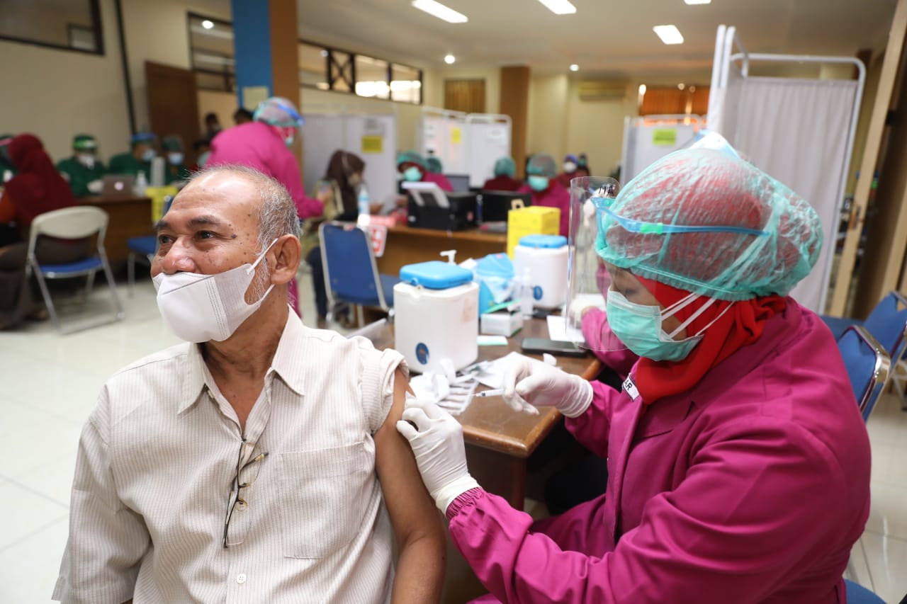 MADIUN – Ratusan pedagang pasar tradisional di Kota Madiun mengikuti vaksinasi pertama yang diselenggarakan oleh Pemkot Madiun bekerjasama dengan Dinas Kesehatan dan KB serta Dinas Perdagangan. Sebanyak 500 pedagang dan 136 tenaga upahan Dinas Perdagangan Kota Madiun terlihat antusias untuk menjalani vaksinasi pertama yang diselenggarakan di Asrama Haji pada Jumat (16/4). Bapak Walikota Madiun, Drs. H. MAIDI yang turut hadir dalam acara tersebut menyampaikan bahwa target vaksinasi pedagang sebanyak 3600 pedagang, selain itu Kota Madiun mendapatkan tambahan kuota vaksin sebanyak 500 sasaran dari Gubernur Jawa Timur.
